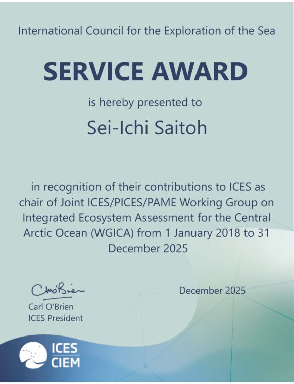齊藤誠一研究推進支援教授(北大名誉教授、初代センター長)がICES(国際海洋探査評議会)よりService Award(サービス賞)を受賞しました。受賞理由は、WGICA(中央北極海における統合的な海洋生態系アセスメントに関するICES/PICES/PAME合同作業部会)の共同議長を2018年から2025年までの8年間務め、グループメンバーと共に、海洋科学およびICESネットワーク内での効果的な協力関係の構築に重要な貢献を果し、ICESの活動へ貢献したことです。