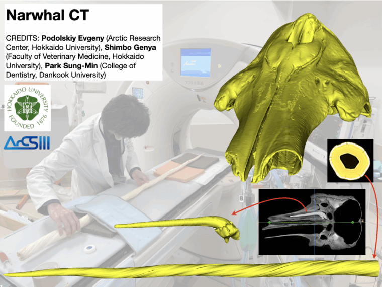 On February 12, 2026, for research and exhibition purposes, the tusk, skull, and lower jaw (i.e., mandible) of the narwhal were imaged with Computed Tomography (CT). This work is a collaboration between Dr.Evgeny Podolskiy (Arctic Research Center, Hokkaido University, Japan), Dr. Genya Shimbo (Faculty of Veterinary Medicine, Hokkaido University, Japan), and Dr. Sung-Min Park (College of Dentistry, Dankook University, Republic of Korea).